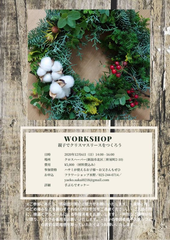 イベントの様子を写真で撮影させていただき、フラワーショップ水野やクロスハーバーのwebやSNSでご利用させていただく可能性がございます。ご希望されない方は、当日主催者へお声がけいただければ幸いです。